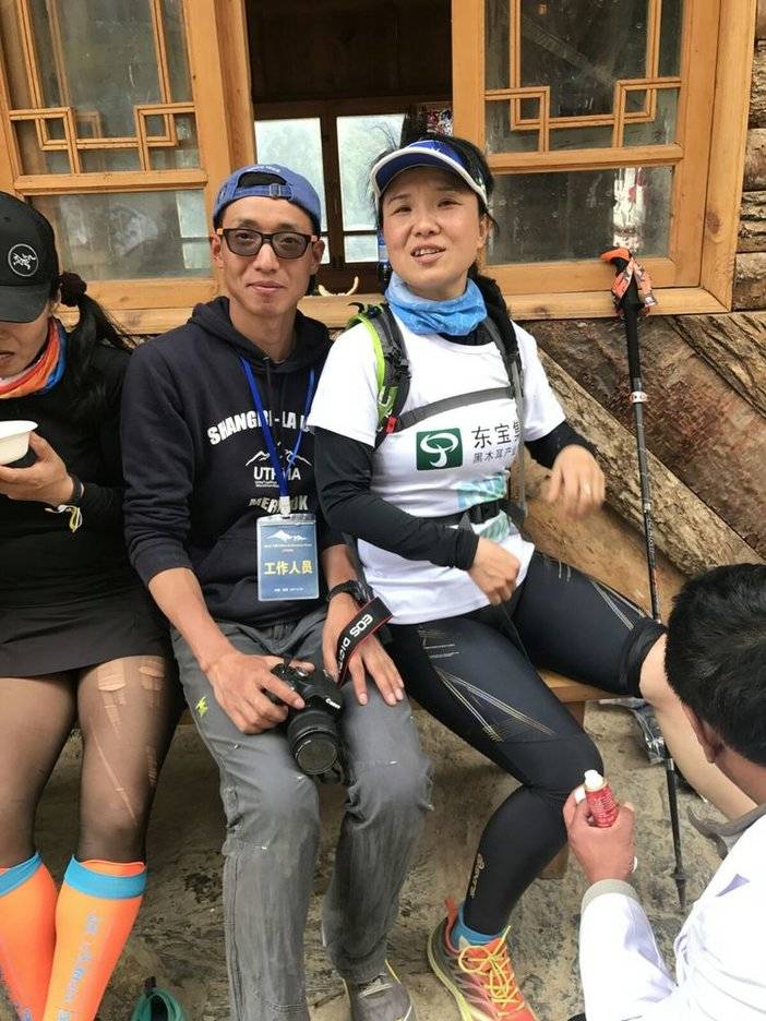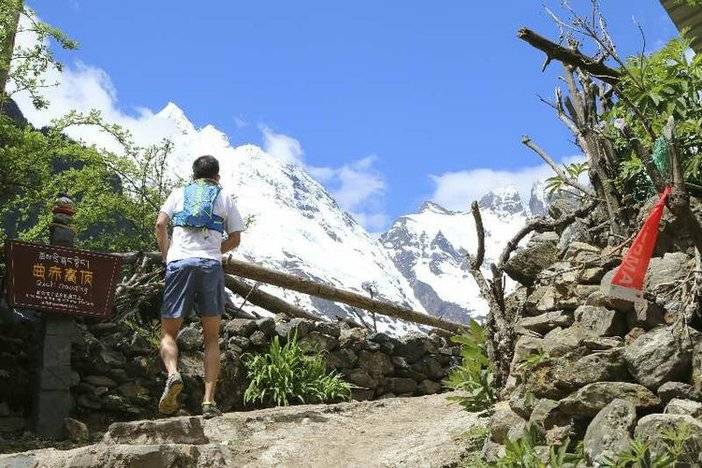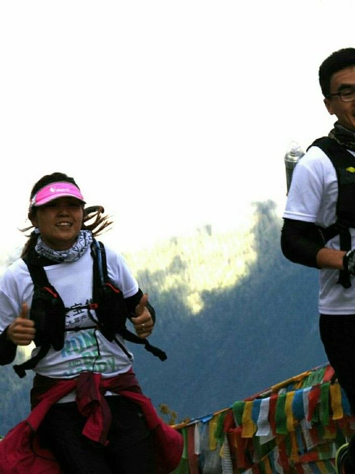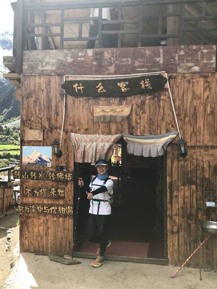 三十八公里处,上雨崩村补给点,遇见了那个笑魇如花的宝宝,恰巧她正在拍照,而旁边什么客栈上的那几个字却特别温暖人心:“转山转水转佛塔,不为修来世,只为途中与你相遇”。然后再次遇见了老虎,遇见了普神,遇见刚哥,遇见大师,还有同行的君君,会心的笑了,所有的疲惫烟消云散,唯有眼中那个相互鼓励而又坚定的眼神:加油!此时已经是下午四点,已经在路上整整奔跑九个小时。